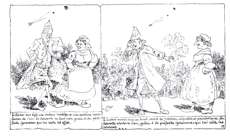 | A peine le Docteur s'est-il mis à rédiger la description qu'il entend sa servante crier qu'à présent on voit comme deux lunes. | Le Docteur accourt en s'écriant: Satellite!!.... Satellite!!!!!!! | Mais ne pouvant se dissimuler que le satellite gravite directement sur son jardin, le Docteur qui prévoit un choc de planètes, entre dans une terreur inexprimable. La servante rit grâce à sa profonde ignorance qui lui voile les causes et les conséquences. |