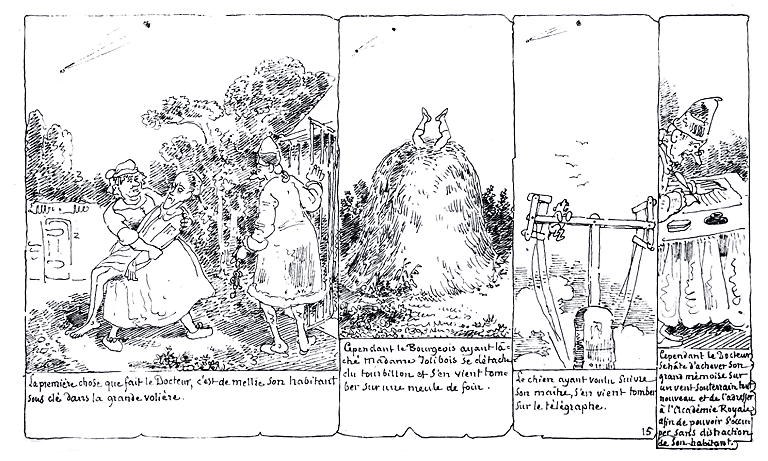 | La première chose que fait le Docteur, c'est de mettre son habitant sous clé dans la grande volière. | Cependant le Bourgeois ayant lâché Madame Jolibois se détache du tourbillon et s'en vient tomber sur une meule de foin. | Son chien ayant voulu suivre son maître, s'en vient tomber sur le télégraphe. | Cependant le Docteur se hâte d'achever son grand mémoire sur un vent souterrain tout nouveau et de l'adresser à l'Académie Royale, afin de pouvoir s'occuper sans distraction de son habitant. |