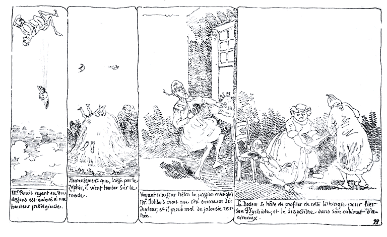 | Mr. Pencil ayant eu du dessous est enlevé à une hauteur prodigieuse. | Heureusement que, laissé par le zéphir, il vient tomber sur la meule. | Voyant cela, (car hélas la passion aveugle) Mr. Jolibois croit que c'est encore un séducteur, et il prend mal de jalousie rentrée. | Le Docteur se hâte de profiter de cette léthargie pour lier son Psychiote, et le suspendre dans son cabinet d'animaux. |