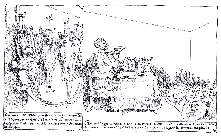 | Revenu à lui, Mr. Jolibois, (car, hélas, la passion aveugle) se persuade que les deux vils séducteurs, de concert avec son épouse, l'ont livré aux bêtes, et ses cheveux se dressent sur sa tête. | L'Académie Royale écoute la lecture du Mémoire sur le vent souterrain tout nouveau, et nomme une commission de trois membres pour analyser le contenu de ses phioles. |