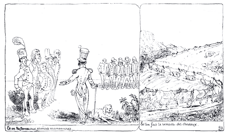 | Et on les forme aux grandes manoeuvres. | Et l'on fait la remonte des chevaux. |