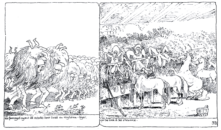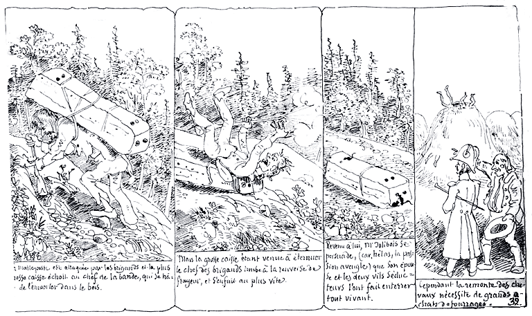 | La malle-poste est attaquée pas les brigands et la plus grosse caisse échoit au chef de la bande, qui se hâte de l'emporter dans les bois. | Mais la grosse caisse étant venue à éternuer le chef des brigands tombe à la renverse de frayeur, et s'enfuit au plus vite. | Revenu à lui, Mr. Jolibois se persuade, (car, hélas, la passion aveugle) que son épouse et les deux vils séducteurs l'ont fait enterrer tout vivant. | Cependant la remonte des chevaux nécessite de grands achats de fourrages. |