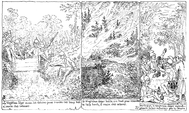 | Le Vingtième-léger ouvre les écluses pour inonder les lieux bas à cause des voleurs. | Le vingtième léger brûle un bois pour incendier les lieux hauts, à cause des voleurs. | Après quoi, le vingtième léger ayant chaud se fait rafraîchir par le maire. |