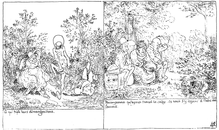 | Ce qui triple leurs démangeaisons. | Heureusement qu'ayant trouvé la caisse, ils vont s'y asseoir à l'abri des fourmis. |