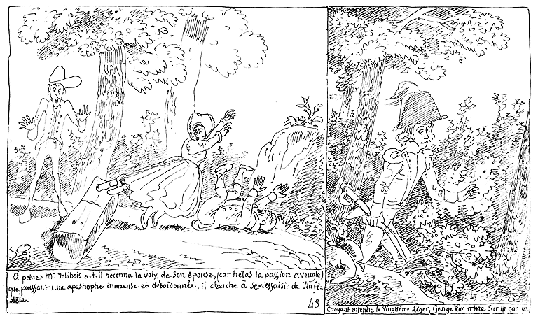 | A peine Mr. Jolibois a-t-il reconnu la voix de son épouse, (car hélas la passion aveugle) que, poussant une apostrophe immense et désordonnée, il cherche à se ressaisir de l'infidèle. | Croyant entendre le Vingtième-léger, George Luçon tire sur la gauche. |