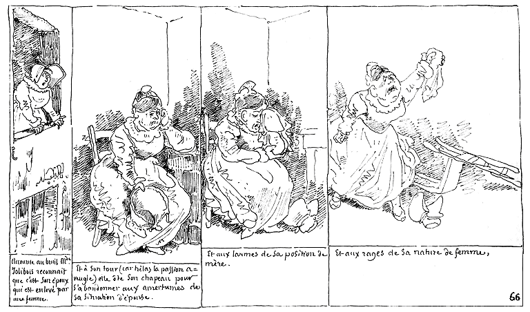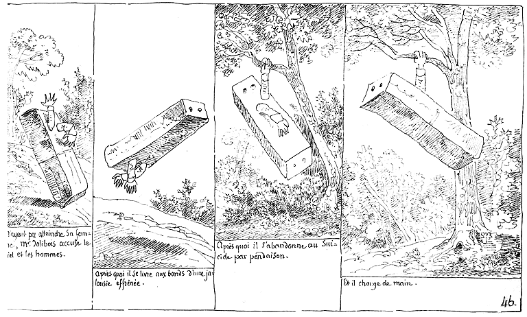 | N'ayant pu atteindre sa femme, Mr. Jolibois accuse le ciel et les hommes. | Après quoi il se livre aux bonds d'une jalousie effrénée. | Après quoi il s'abandonne au suicide par pendaison. | Et il change de main. |