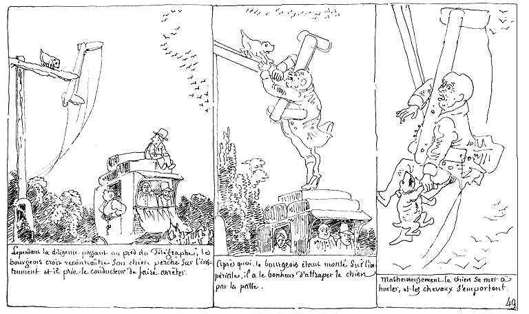 | Cependant la diligence passant au pied du Télégraphe, le bourgeois croit reconnaître son chien perché sur l'instrument et il prie le conducteur la faire arrêter. | Après quoi, le bourgeois étant monté sur l'impériale, il a le bonheur d'attraper le chien par la patte. | Malheureusement le chien se met à hurler, et les chevaux s'emportent. |