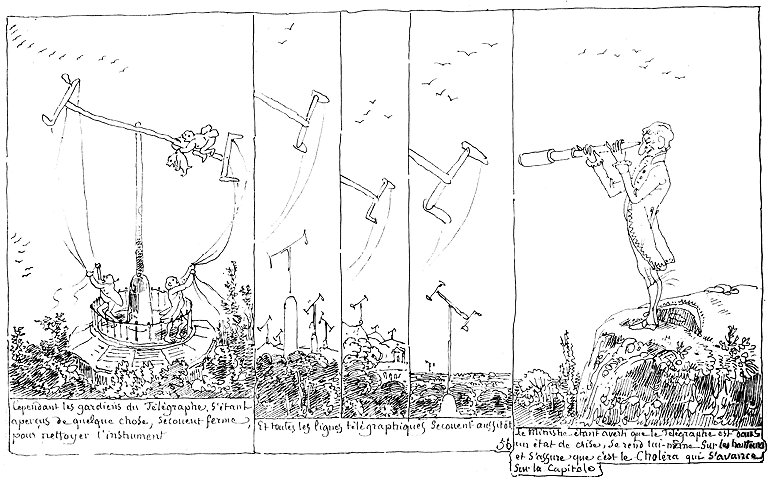 | Cependant les gardiens du Télégraphe, s'étant aperçus de quelque chose, secouent ferme, pour nettoyer l'instrument. | Et toutes les lignes télégraphiques secouent aussitôt. | Le ministre étant averti que le Télégraphe est dans un état de crise, se rend lui-même sur les hauteurs et s'assure que c'est le Choléra qui s'avance sur la capitale. |