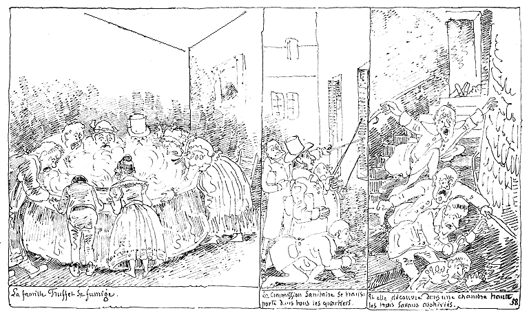 | La famille Truffet se fumige. | La commission sanitaire se transporte dans tous les quartiers. | Et elle découvre dans une chambre haute les trois savants asphyxiés. |