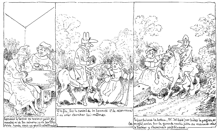 | Cependant le Docteur ne recevant point de nouvelles ni de son mémoire, ni de son Psychiote, tombe dans un grand abattement. | A la fin, sur le conseil de sa servante, il se détermine à en aller chercher lui-même. | En poursuivant la battue, Mr. Jolibois (car hélas la passion aveugle) arrive sur la grande route juste au moment où le Docteur y cheminait paisiblement. |