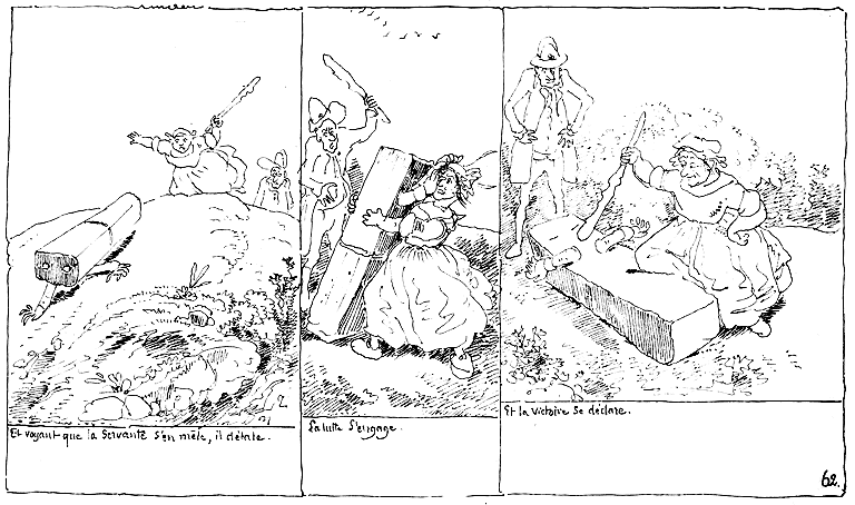 | Après que le Vingtième-léger s'est éloigné, George Luçon revêt les habits du Capitaine Ricard, l'habille des siens, et gagne les champs. Ce qui est cause que le Capitaine Ricard est enterré sans les honneurs militaires. | Cependant Mr. Jolibois (car, hélas, la passion aveugle) est inquiété par les rats qui ont agrandi les trous de la caisse. | Cependant les trois fugitifs qui sont harassés de fatigue ont le malheur de s'asseoir sur une fourmilière. |