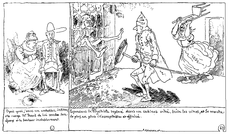 | Après quoi, dans un entretien intime, elle charge Mr. Pencil de lui rendre son époux et le bonheur inclusivement. | Cependant le Psychiote replacé dans un cabinet vitré, brise les vitres, et se montre de plus en plus indomptable et effréné. |