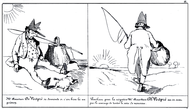 | Mr. Anastase de Vertpré se demande si c'est bien là un poisson. | Penchant pour la négative Mr. Anastase de Vertpré ne se sent pas le courage de tenter le sort de nouveau. |