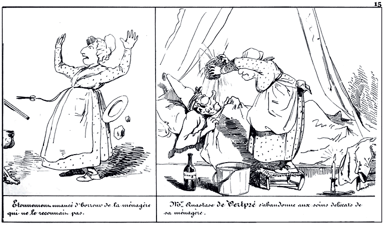 | Étonnement nuancé d'horreur de la ménagère qui ne le reconnais pas. | Mr. Anastase de Vertpré s'abandonne aux soins délicats de sa ménagère. |