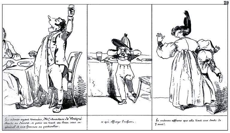 | Les crèmes ayant tournées, Mr. Anastase de Vertpré chante au dessert, et porte un toast au beau sexe en général et aux femmes en particulier, | ce qui effraye l'enfant. | La maman affirme que cela tient aux dents de 7 ans. |