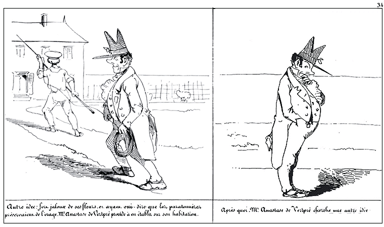 | Autre idée: fou jaloux de ses fleurs, et ayant ouï-dire que les paratonnerres préservaient de l'orage, Mr. Anastase de Vertpré procède à en établir sur son habitation. | Après quoi Mr. Anastase de Vertpré cherche une autre idée. |