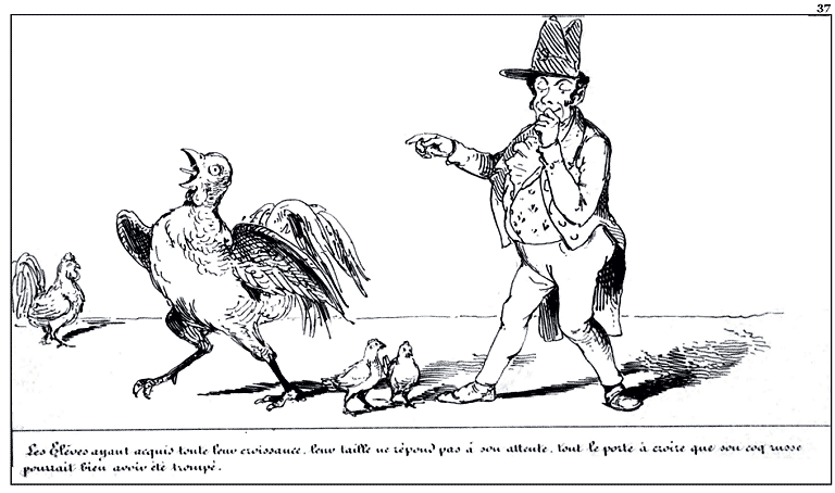| Cette autre idée étant de remonter sa basse cour, Mr. Anastase de Vertpré achète un superbe coq russe. | Joie bien légitime de Mr. Anastase de Vertpré en montrant son acquisition à sa ménagère. |