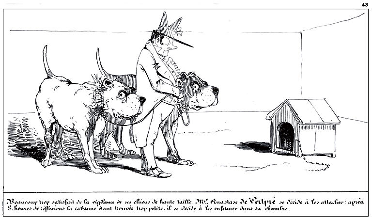 Éclairé par la mort affreuse de son chien de garde, Mr. Anastase de Vertpré a l'heureuse idée de se munir de deux chiens de haute taille: il les promène pour leur faire connaître les localités.