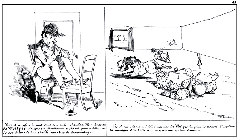 | Réduit à passer la nuit dans son antichambre, Mr. Anastase de Vertpré s'emploie à chercher un expédient pour se débarrasser de ses chiens de haute taille sans trop de désavantage. | Les chiens évitent à Mr. Anastase de Vertpré la peine de trouver l'expédient; la ménagère et la basse cour en éprouvent quelque dommage. |