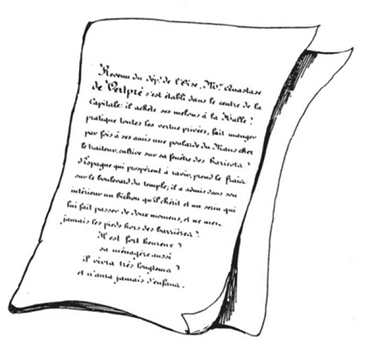 | Venant à récapituler avant que de s'endormir, Mr. Anastase de Vertpré n'est pas sûr que sa soirée ait été fertile en agréments. | Et penche à croire qu'il pourrait bien introduire quelques améliorations dans son organisation domestique. |