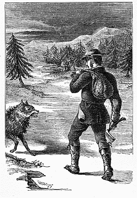 "If my uncle had let the wolf see that he was afraid of him, he would have grown bolder, and have run after him and seized him. All animals are afraid of brave men, but not of cowards. When the beast came too near, my uncle faced him and showed the bright axe, and the wolf then shrank back a few paces. When my uncle got near the shore, he heard a long wild cry, as if from twenty wolves at once. It might have been the echoes from the islands that increased the sound; but it was very frightful and made his blood chill, for he knew that without his rifle he should stand a poor chance against a large pack of hungry wolves. Just then a gun went off; he heard the wolf give a terrible yell, he felt the whizzing of a bullet pass him, and turning about, saw the wolf lying dead on the ice. A loud shout from the cedars in front told him from whom the shot came; it was my father, who had been on the look-out on the lake shore, and he had fired at and hit the wolf when he saw that he could do so without hurting his brother."[Pg 20]