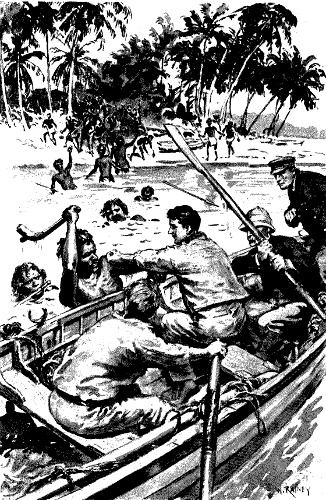 Such indeed was the case. Even although they[Pg 315] had started to recapture the Spaniard on the direct orders of their paramount chief, Captain Holbaek, nothing would induce them to cross the imaginary line that formed the pale to the prohibited expanse of lagoon.